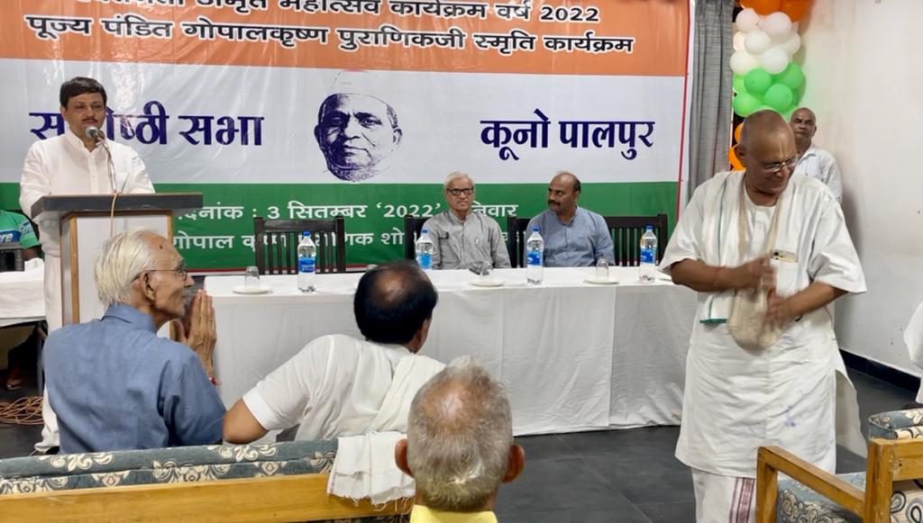 वरिष्ठ पत्रकार एवं लेखक प्रमोद भार्गव द्वारा गोपाल कृष्ण पुराणिक जी के जीवन पर आधारित वक्तव्य में कहा कि उन्होंने देश के स्वतंत्रता आंदोलन में राजनीतिक एवं रचनात्मक रूप से जो सहयोग एवं अपना जीवन समर्पित किया वह आज की पीढ़ी के लिए प्रेरणा का भंडार है। पंडित जी द्वारा पोहरी में आदर्श विद्यालय का संचालन हो अथवा स्वाबलंबी विद्यार्थियों की फौज तैयार करना अथवा आसपास क्षेत्र के किसानों को आर्थिक रूप से समृद्ध करना, इन तीनों ही क्षेत्रों में पंडित जी के द्वारा कार्य किए गए वह भी तब जब यह देश अंग्रेजों के अधीन होकर गुलाम कहलाया करता था, परंतु गुलामी की बेड़ियों को तोड़ने के लिए पंडित गोपाल कृष्ण जी की विचारधारा एवं उनकी सोच काफी बड़ी थी, जिसके दम पर उन्होंने विपरीत परिस्थितियों के बावजूद स्वतंत्रता आंदोलन में अपने जीवन को समर्पित कर दिया, सर्वस्व निछावर कर दिया। पंडित गोपालकृष्ण केवल एक व्यक्ति नहीं थे अपितु अपने आप में सदाचारी व्यक्तित्व थे। उस समय की सरकारी स्वतंत्रता संग्राम के क्रांतिकारियों को वह न केवल छर्च और कूनो के जंगल में रहने की व्यवस्था करवा देते बल्कि अपने आदर्श विद्यालय में भी क्रांतिकारियों को छद्म नाम से शिक्षक बनाकर रखते थे उन्होंने पोहरी में ग्रामीण विकास एवं स्वदेशी स्वरोजगार मूलक कार्यों को प्रारंभ कराया जिसमें खादी निर्माण कागज निर्माण माचिस उद्योग मधुमक्खी पालन आदि कई तरह की कल आए लोगों को सिखा कर उन्हें स्वावलंबी बनाया जाता था। कार्यक्रम के अंत में संदीप बंधु शर्मा द्वारा पधारे हुए अतिथियों एवं वक्ताओं का शॉल, श्रीफल के साथ स्मृति चिन्ह से सम्मान किया गया। कार्यक्रम में सैकड़ों की संख्या में दूर-दूर से पधारे पुराणिक जी के परिवार से जुड़े लोग एवं लेखक, पत्रकार आदि उपस्थित रहे।