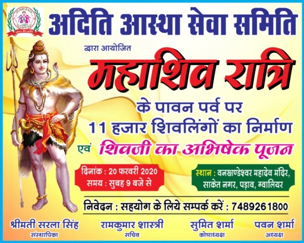 महिमा न्यूज़,ग्वालियर| अदिति आस्था सेवा समिति की ओर से महाशिव रात्रि के इस पवन पर्व पर हुआ "11 हजार शिवलिंगों का निर्माण एवं शिव जी का अभिषेक पूजन". इस कार्यक्रम का आयोजन महाशिवरात्रि के एक दिवस पूर्व किया गया. कार्यक्रम का शुभारंभ अदिति शर्मा द्वारा गणेश वंदना की प्रस्तुति से किया गया इस कार्यक्रम के माध्यम से संस्था द्वारा लोगो मे ईश्वर के प्रति आस्था का विस्तार करना है तथा मानव हित मे काम करना चाहिए और आगे बढ़ना चाहिए. डॉ वीणा प्रधान ने बताया कि सृष्टि के रचियता भगवान भोलेनाथ है और बही