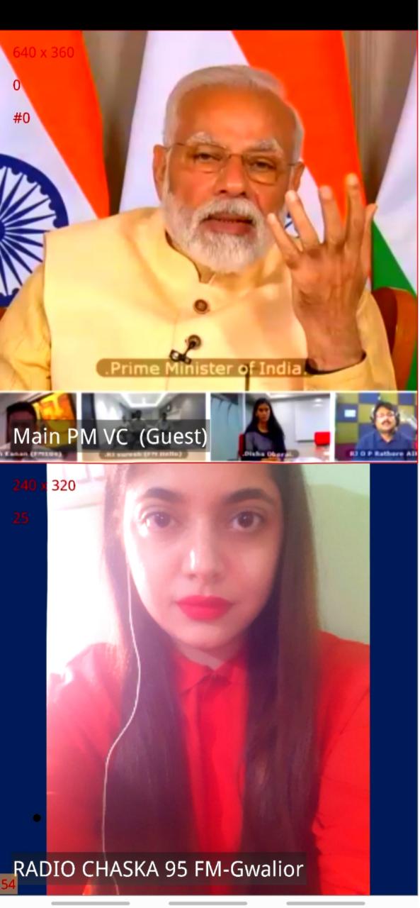 जिसमें मध्य प्रदेश से रेडियो चस्का 95fm को भी चुना गया जिसमें आरजे चाहत हुई शामिल।लाइव वीडियो कॉन्फ्रेंसिंग में प्रधानमंत्री ने आरजेस से अपनी मन की बात साझा की। उन्होंने बताया की कोरोना वायरस को लेकर अभी भी कुछ लोगों में जागरूकता की कमी है हमें यह बात सभी को समझा नहीं है मुझे डर है की कोरोना वायरस गांव-गांव तक ना पहुंच जाए क्योंकि जहां टीवी और फोन काम नहीं करते वहां लोग रेडियो एफएम सुनते हैं और इस समय लोगों को जागरूक करने में आरजे एक अहम रोल निभा रहे हैं ।साथ ही उन्होंने यह भी कहा कि हमें निरंतर प्रयास करना है और यह मैसेज देना है कि लोग अपने घर में ही रहे जरूरत पड़ने पर ही बाहर निकले।