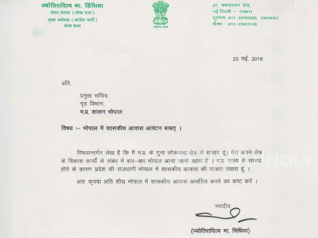 प्रदेश अध्यक्ष बनने के बाद कमलनाथ भोपाल में डेरा डाले हुए हैं, तो दिग्विजय सिंह की भी सक्रियता बढ़ गई है। अब गुना शिवपुरी सांसद ज्योतिरादित्य सिंधिया ने भी सरकार से शासकीय आवास की मांग की है। राजधानी में सरकारी आवास की मांग से साफ है कि, सिंधिया अब राजधानी में अपनी सक्रियता बढ़ाना चाहते हैं। 23 मई को ज्योतिरादित्य सिंधिया ने मध्यप्रदेश सरकार के गृह विभाग के प्रमुख सचिव को पत्र लिखकर भोपाल में शासकीय आवास की मांग की है। उन्होंने लिखा है कि, मैं मध्यप्रदेश के गुना संसदीय क्षेत्र से सांसद हूं। क्षेत्र के विकास कार्यों के संबंध में बार-बार भोपाल आना जाना रहता है। सांसद होने के नाते में मध्यप्रदेश की राजधानी भोपाल में शासकीय आवास की पात्रता रखता हूं इसलिए अतिशीघ्र मुझे शासकीय आवास आवंटित करने की कृपा करें।