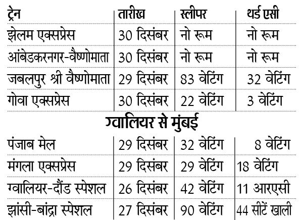 रेलवे ने यात्रियों की परेशानी काे कम करने के लिए फिरोजपुर से मुंबई के बीच पंजाब मेल चला दिया है। इसके बाद भी मुंबई जाने वाली मंगला एक्सप्रेस, ग्वालियर-दौंड स्पेशल में नए साल के लिए लंबी वेटिंग का टिकट मिल रहा है। 29 और 30 दिसंबर को ग्वालियर होकर मुंबई जाने वाली सभी ट्रेनों में यात्रियों को वेटिंग का टिकट मिल रहा है। इसी तरह नए साल का जश्न गोवा में मनाने की तैयारी बड़ी संख्या में लोगों ने की है। इससे गोवा एक्सप्रेस में भी अभी से दिसंबर के अंत का वेटिंंग का टिकट मिल रहा है।