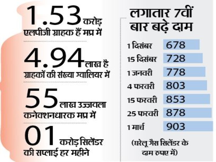 रसोई गैस फिर 25 रुपए महंगी:5 दिन में 50 रुपए बढ़ा दिए दाम, भोपाल में 825 और ग्वालियर में 903 रुपए का सिलेंडर