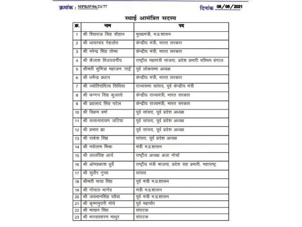 प्रदेश कार्यसमिति में 162 सदस्य, 218 विशेष आमंत्रित सदस्य, 23 स्थायी आमंत्रित सदस्य हैं। लेकिन, इनमें पूर्व मुख्यमंत्री उमा भारती का नाम नहीं है। स्थाई आमंत्रित सदस्यों में मुख्यमंत्री शिवराज सिंह चौहान, केंद्रीय मंत्री थावर चंद गेहलोत, केंद्रीय मंत्री नरेद्र सिंह तोमर, भाजपा के राष्ट्रीय महासचिव कैलाश विजयवर्गीय, सुमित्रा महाजन, केंद्रीय मंत्री धर्मेंद प्रधान, ज्योतिरादित्य सिंधिया, केंद्रीय राज्यमंत्री फग्गन सिंह कुलस्ते, केंद्रीय राज्य मंत्री प्रहलाद पटेल, पूर्व प्रदेश अध्यक्ष रहे विक्रम वर्मा, सत्यनारायण जटिया और प्रभात झा को शामिल किया गया है।इसके साथ ही सूची राकेश सिंह सांसद व पूर्व प्रदेश अध्यक्ष, नरोत्तम मिश्रा गृह एवं संसदीय कार्यमंत्री, लोक निर्माण मंत्री गोपाल भार्गव समेत पूर्व मंत्री लाल सिंह आर्य, ओमप्रकाश ध्रुवे, सांसद सुधीर गुप्ता, पूर्व मंत्री माया सिंह एवं जयभान सिंह पवैया तथा कृष्ण मुरारी मोघे, माखन सिंह और भगवत शरण माथुर को शामिल किया गया है। पिछली कार्य समिति में सदस्य रहे पूर्व जिला अध्यक्ष सुरेंद्रनाथ सिंह को इस बार प्रदेश कार्यसमिति में जगह नहीं मिली है, जबकि भोपाल के पूर्व जिलाध्यक्षों को शामिल कर लिया गया है।