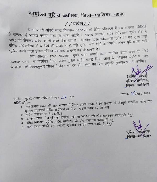 मंगलवार की शाम को पुलिस कप्तान अमित सांघी के पास एक वीडियो पहुंचा है। वीडियो में एक पुलिस जवान ट्रक को रोककर खड़ा हुआ है। वह ट्रक चालक के कैबिन की ओर हाथ बढ़ाता दिखाई दे रहा है। ट्रक चालक कुडछ पूछता है। सिपाही इशारे में जल्दी करने की कहता है और इसके बाद ट्रक चालक उसे रूपये देता है। जिसे लेकर सिपाही जेब में रखता है और एक कागज देता है। यह वीडियो शाम से ही शहर में खूब वायरल हो रहा था वीडियो में जो जगह दिखाई गयी है वह झासी हाइवे पर सिकरौदा के पास की है। वीडियो में दिखाई देने वाला जवान की पहचान आंतरी में पदस्थ रविसिंह के रूप होना बताईजा रही है। पुलिस कप्तान ने मामले की जांच सौंप दी है। बुधवार को इस मामले में कार्यवाही होना तय है।